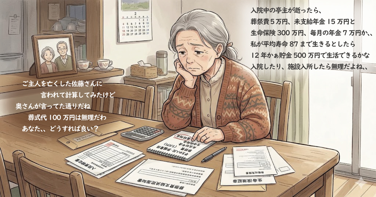 葬式代の心配は当然だけど、死後に入ってくるお金、出て行くお金、配偶者の逝去後は独居になる方、以後の生活を守る為にもしっかり試算しておきましょう。
