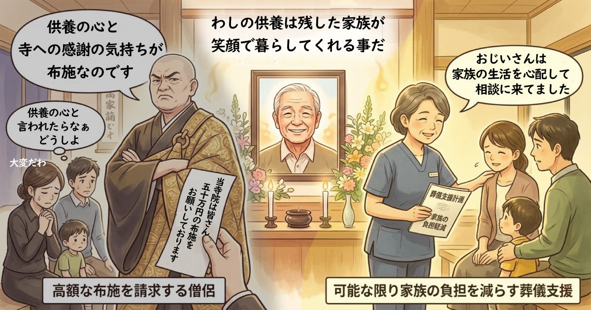 何を言った所で残る家族の生活に支障が出る高額な布施など論外、自分のしている事が本気でその額以上の価値があると思ってるとしたら庶民の実態を知らなさ過ぎる。