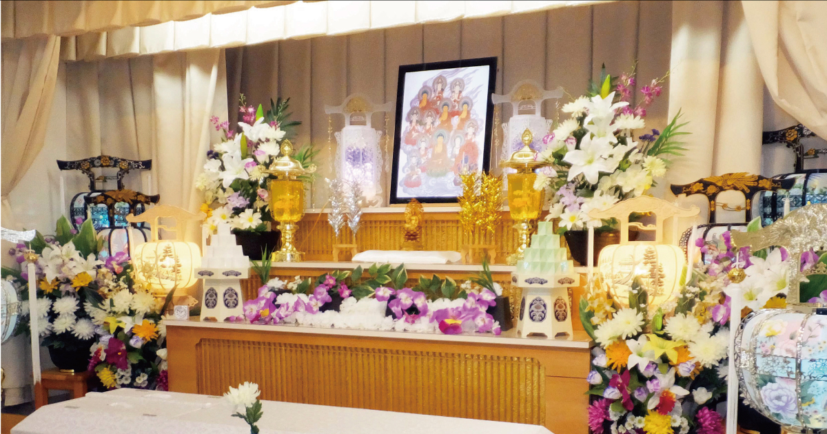 公営斎場がありましたが150~200名規模の広さで祭壇も大きくなる訳ですが、祭壇が大きいとは祭壇に飾る供物類、生花の費用も高額になるわけで、公営斎場でありながら葬式後は不要になる供物類や生花をわずか1時間の葬式に何十万円と掛けさせるような式場の造りは納得できませんので自社施設が絶対条件だと考えた。