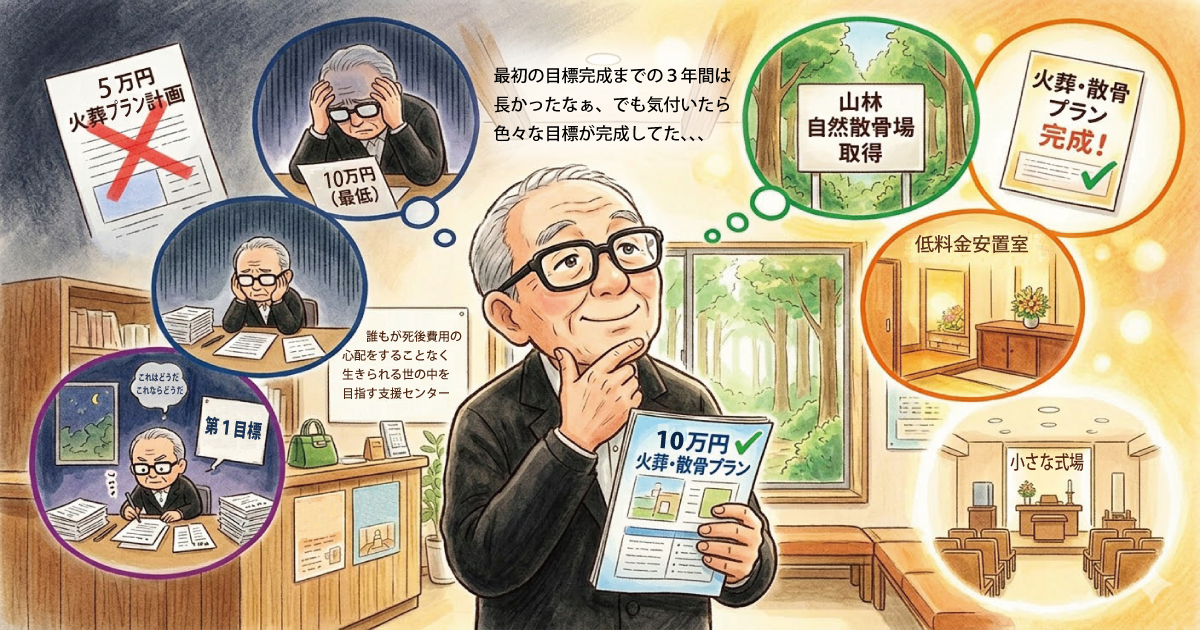 あんしんサポートの名称が決まり、登記申請後あえて「葬儀支援センター」を付けたが、国保から支給される葬祭費5万円で骨壺に納まれる葬儀屋は皆無だった事、それが可能になれば死後費用の心配をしながら生きる必要が無くなり、一石二鳥と第一目標としたのです。