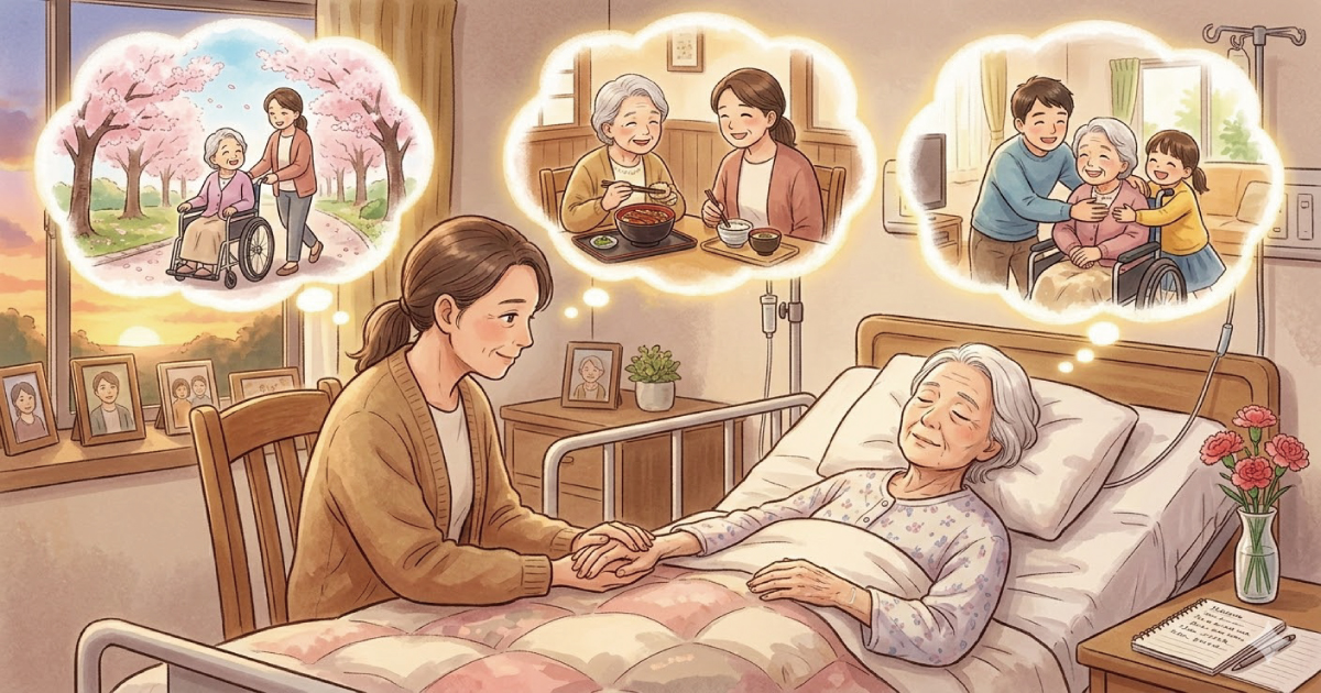 余命宣告受けた後なら、担当医に言えば外出許可もしてくれるし、食べたい物を食べさせたり、逢いたい人に逢わせるのも否定されないはずです。
